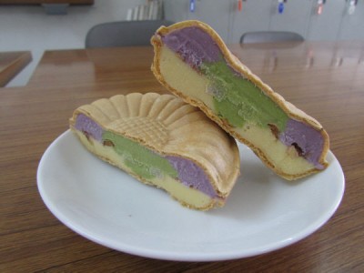 このもなかは割ると中のアイスが黄色・緑・紫の3層に分かれており、見た目も楽しめてなおかつ3種類の味を楽しめる今までにない商品に出来上がっています。